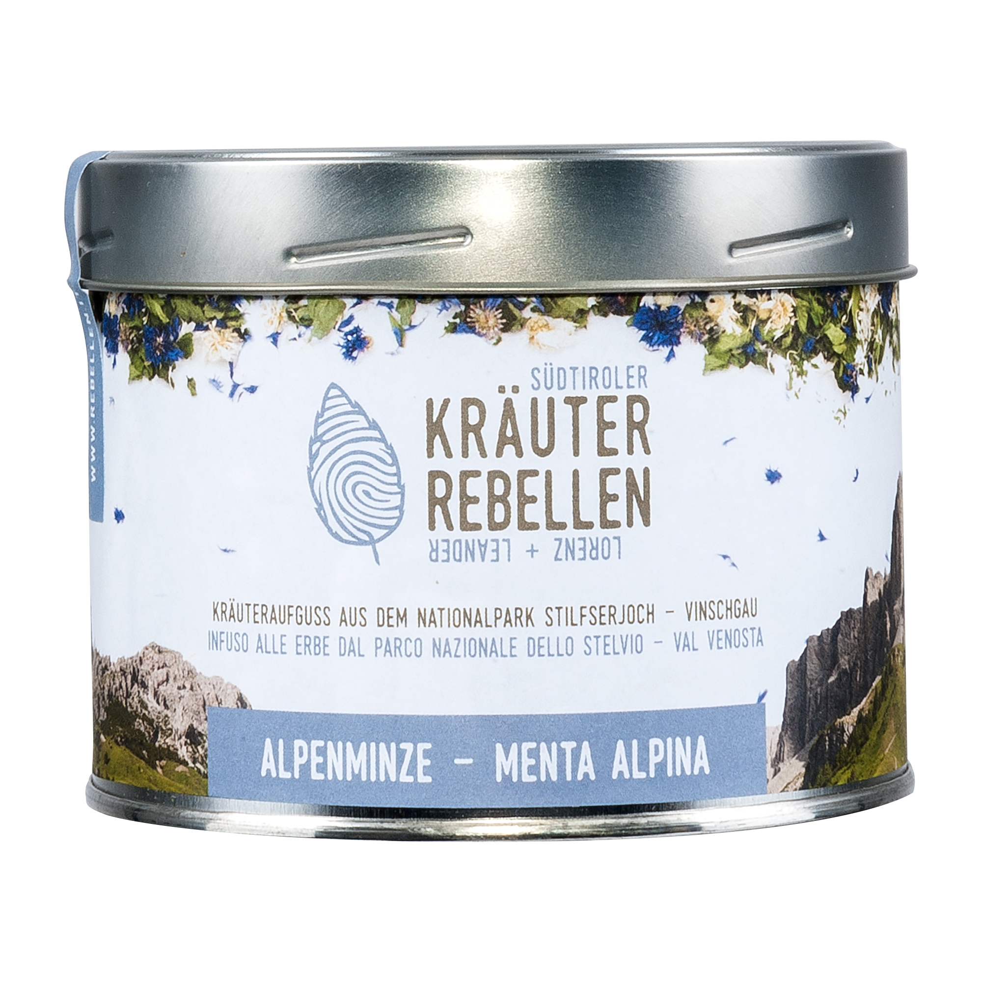 Der Kräuteraufguss Alpenminze von den Südtiroler Kräuter Rebellen ist eine erfrischende Mischung von Kornblumen und drei Sorten Minze in einer schönen Tee Dose. Die handgepflückten Kräuter für den Kräuteraufguss stammen aus dem Nationalpark Stilfserjoch.