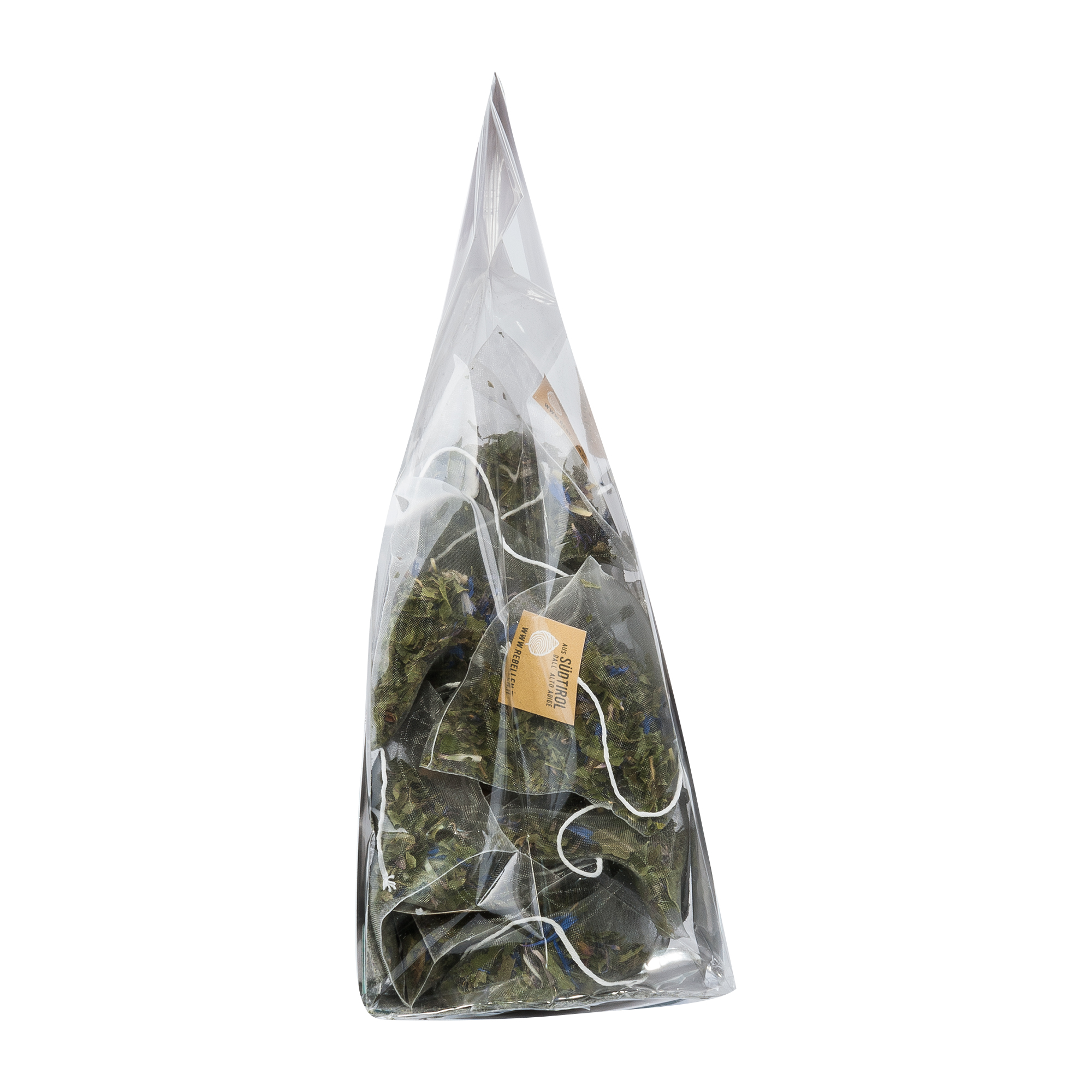 Die Bergkräuter Tee Pyramiden Beutel bestehen aus genfreier Maisstärke in umweltfreundlicher Klarsicht-PP-Verpackung.