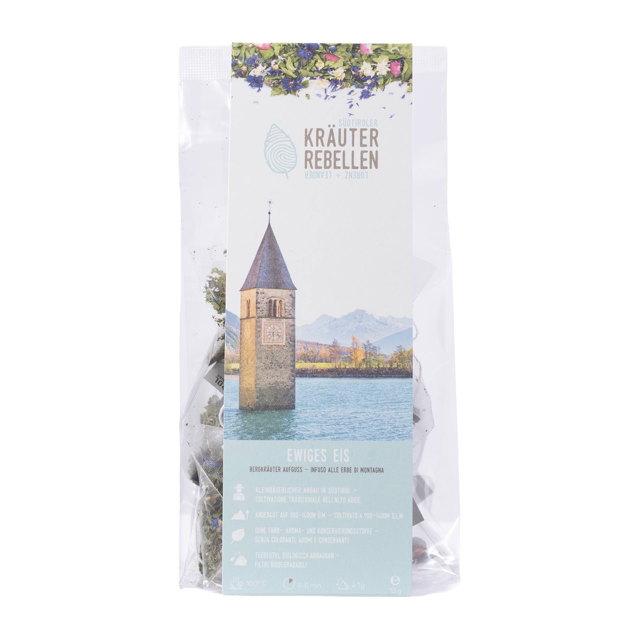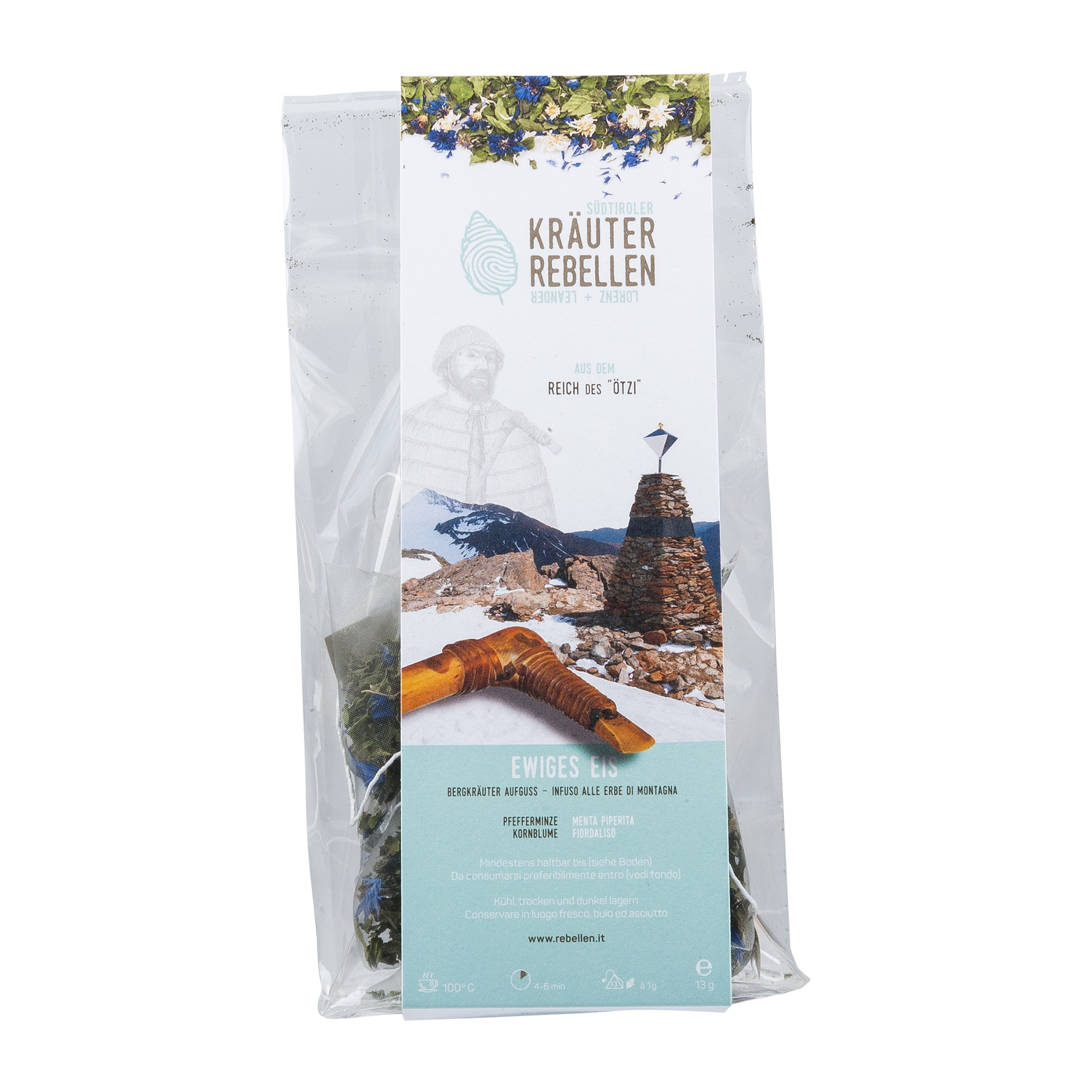 Ewiges Eis ist ein Kräuteraufguss im Tee Beutel von den Südtiroler Kräuter Rebellen. Die handgepflückten Kräuter für den Kräuteraufguss stammen aus dem Reich des Ötzi und des Edelweiss im Vinschgau.