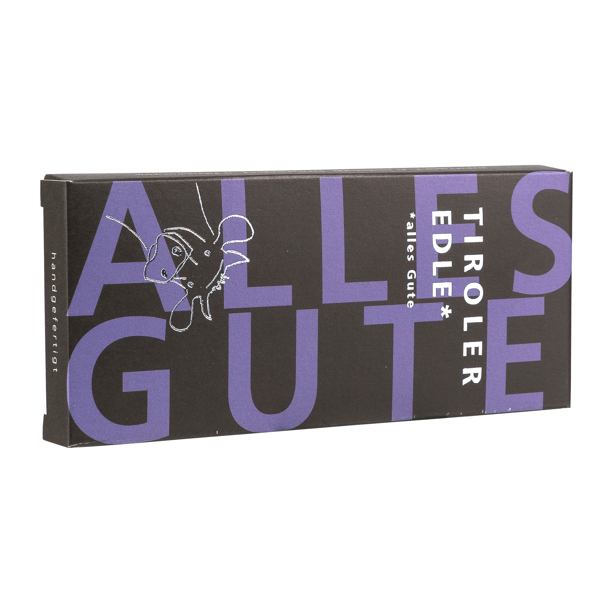 Die Tiroler Edle Schokolade Alles Gute ist eine Mottoschokolade aus purer Milchschokolade. Sie zeigt ganz eindrucksvoll das besondere Milcharoma des Tiroler Grauvieh. Für diese Tiroler Edle handgeschöpfte Schokolade verarbeitet Konditormeister Hansjörg Haag mit großer Sorgfalt feinste Kuvertüre von der Schweizer Firma Felchlin, welche ihm Herkunft der Kakaobohnen und Bezahlung der Kakaobauern über dem fairtrade Preis garantieren. Es gibt so viele Gelegenheiten Alles Gute zu wünschen, zum Geburtstag, zu Muttertag, zum Abschied, als Genehsungswunsch, sag‘s doch mal mit Schokolade.